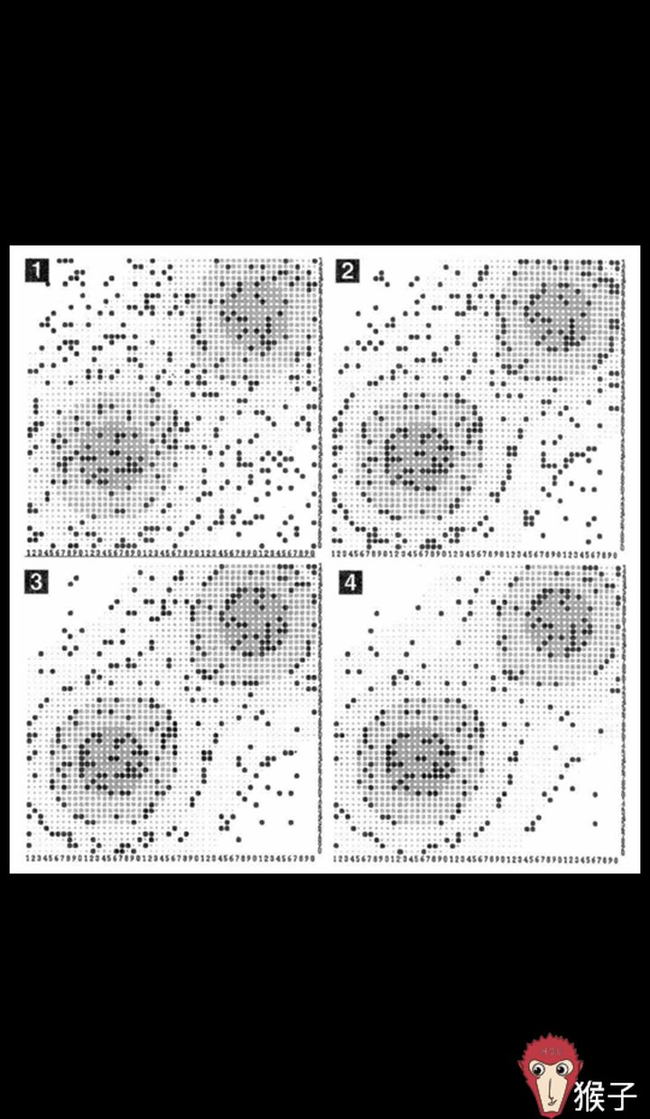 当程序运行期从图1演到图4,糖人们开始围绕两大糖山拢聚,逐渐形成两大部落。无糖区则人烟稀少。而且,糖人们彼此位置分隔颇有效率,任何新长出的糖都会被迅速收割。