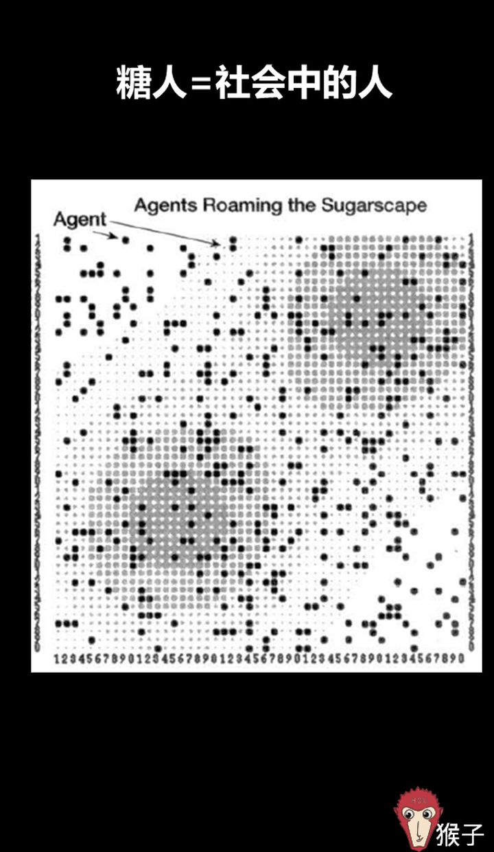 所以,你可以把棋盘看做社会,棋盘中的糖就是社会中的资源,糖人就是在这个社会中活动的人。