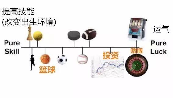 在两个极端中间是其他事情各自技能和运气成分占比不同。比如打篮球更靠近技能端,说明技能权重比运气更高。虽然有时候会因为运气不好,看似已经投中的球在篮筐里来回弹几下竟然出来了,但是提高技能是最有效的。