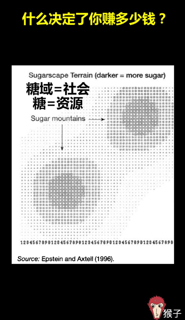 1996年,美国布鲁金斯研究所的两位专家(Epstein和Axtell),用计算机模拟,开发出来了一个人工社会财富积累的模型,称之为“糖域”(Sugarscape)。