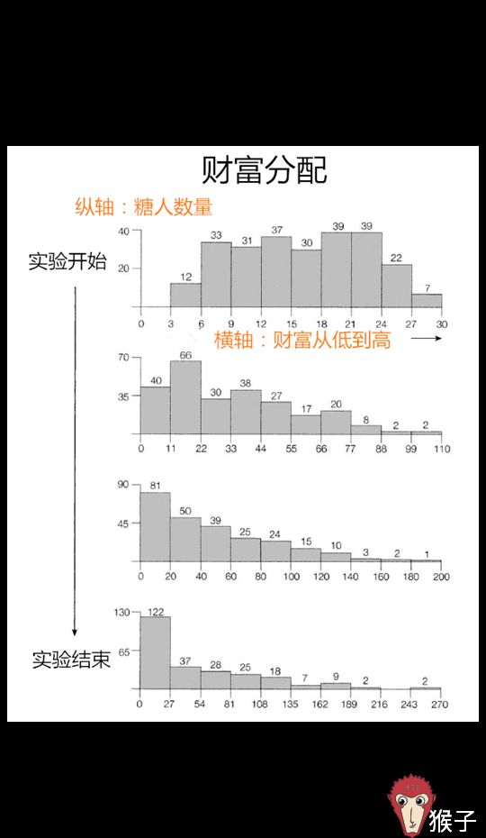 当研究者把目光投向财富变量时,这里的财富是指每个糖人收获的糖的多少来代表,他们发现了一个令人非常意外的现象:这个虚拟社会出现了严重的贫富分化。