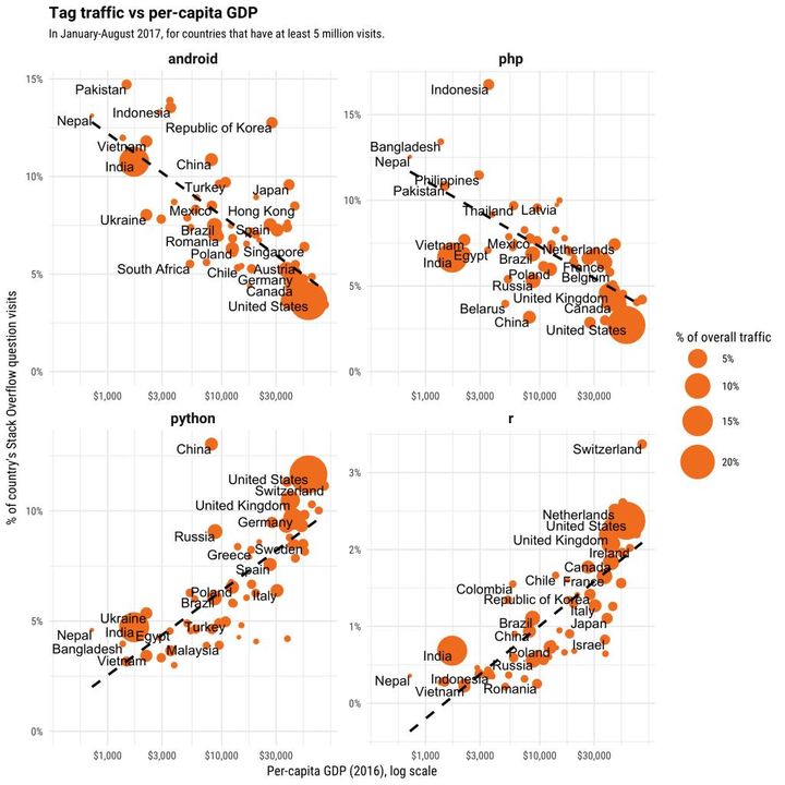 其中横轴是人均GDP从低到高,纵轴是Stackoverflow浏览某编程语言的人数(百分比)。橙色圆圈越大表示访问该技术问题的人数越多。