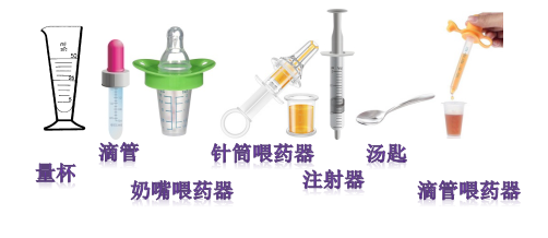 工欲善其事,必先利其器。好的工具可以达到事半功倍的效果。固体制剂需要用少量水溶解后喂给婴幼儿,以防固体颗粒呛至气管酿成严重后果。准备工具包括:①量具,包括带刻度的滴管、量杯等。②容器,包括装水的杯子、碗。③喂药工具,包括滴管式喂药器、医用去针注射器、针筒式喂药器、奶嘴式喂药器、汤匙、药杯等。当然还应准备一些餐巾或纸巾,保持清洁。