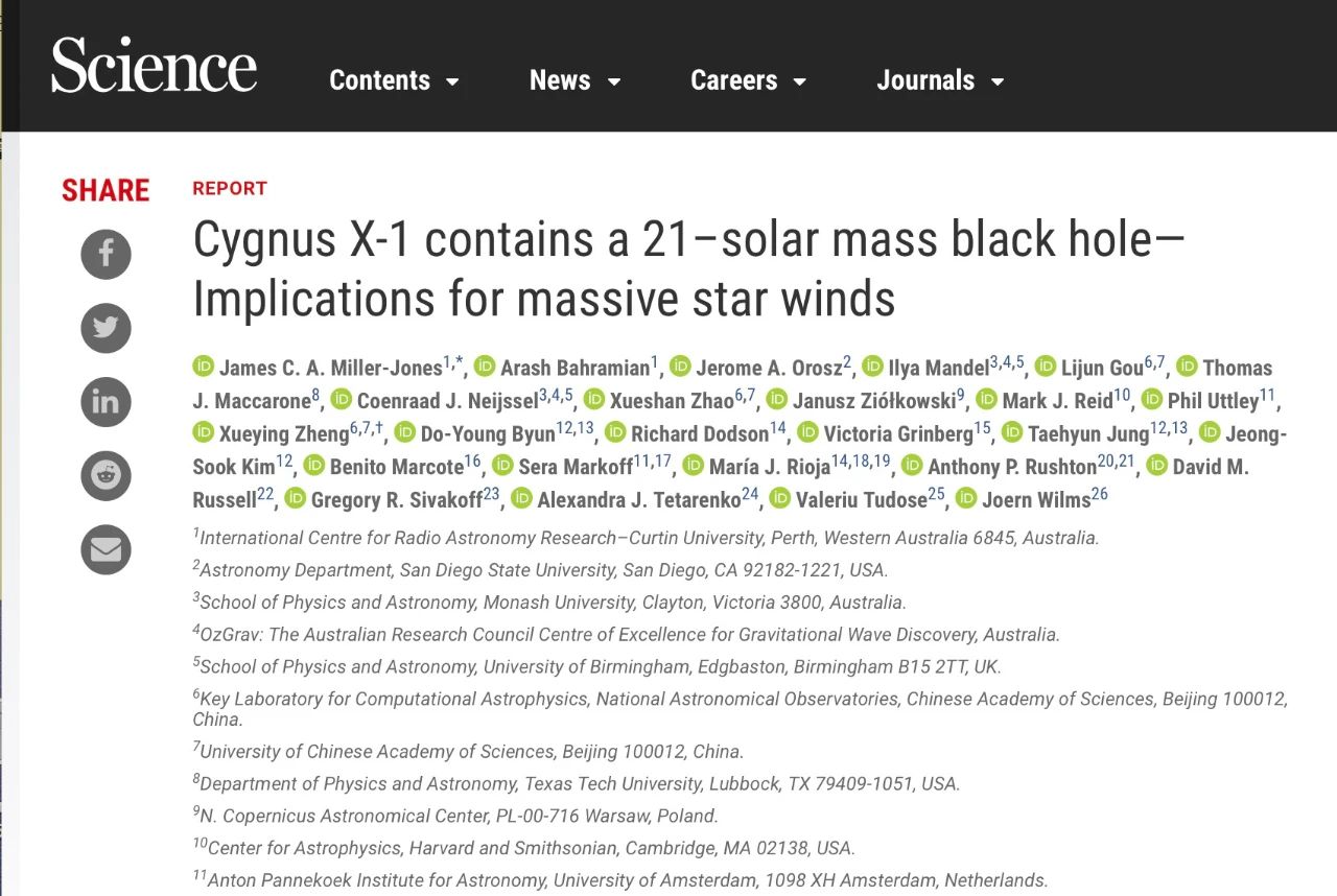 北京时间2月19日凌晨,三篇论文分别在国际顶级学术期刊《科学》(Science)和《天体物理学报》(Astrophysical Journal)上发表,来自于澳大利亚、美国和中国的科学家们联合发布了对黑洞X射线双星天鹅座X1(Cygnus X-1)的最新研究结果。