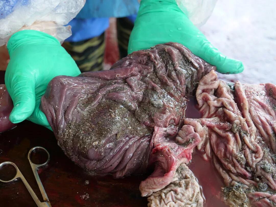 除却泥沙,她的身体基本健康,体内没有什么异常严重的病理表现,我们似乎无法从生理上推测她搁浅的原因——直到主刀老师剪开了她的胃。我无法忘记那时主刀老师的话语和腔调:“天,你们肯定猜不到她的胃里有什么。”