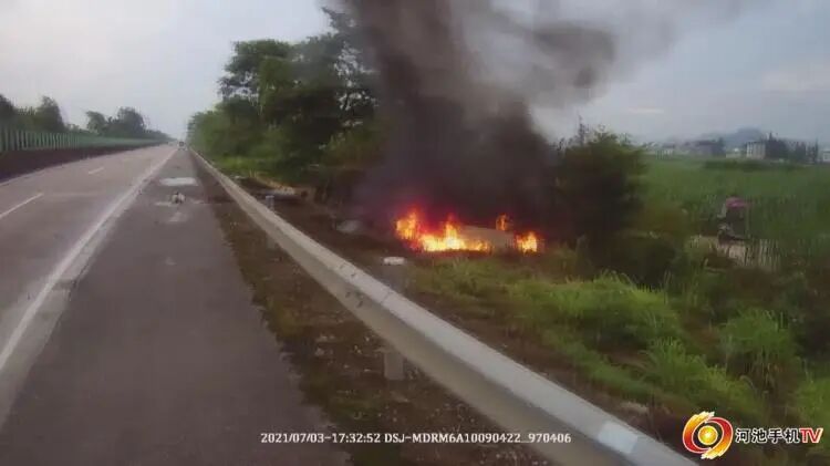 看见一辆车子冲下高速路自燃