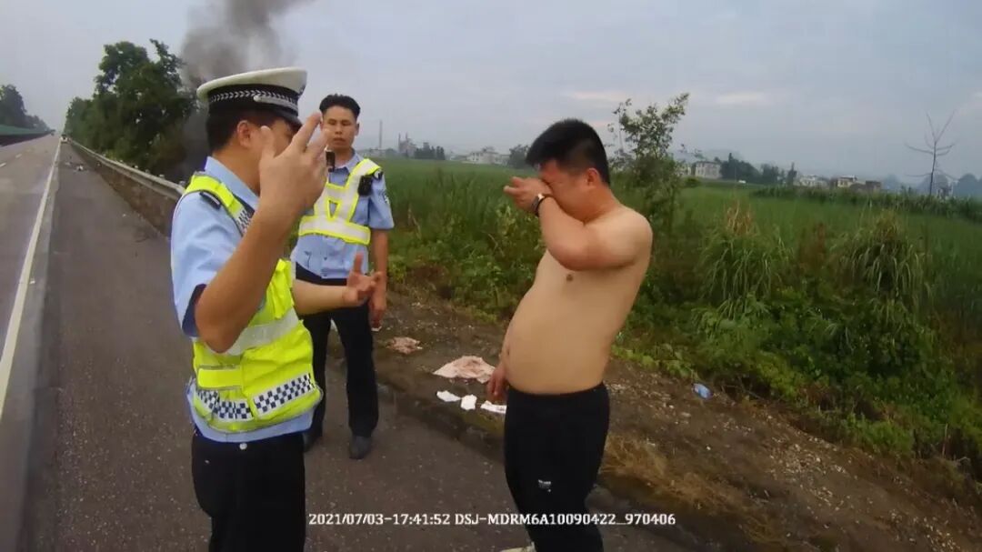 事故现场,一名光着膀子的男青年