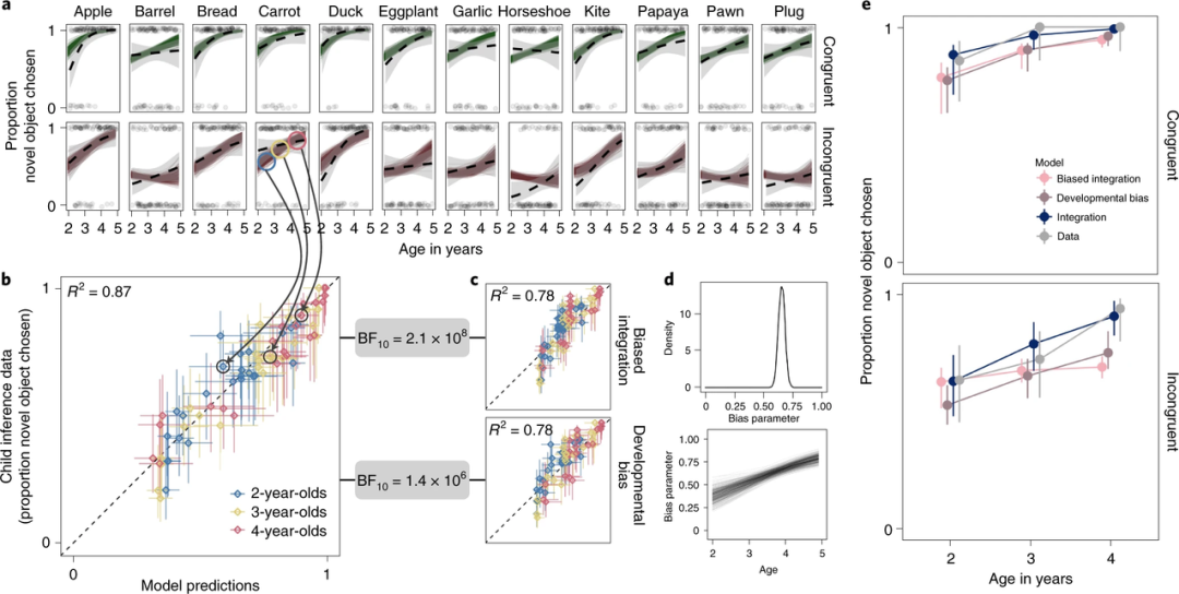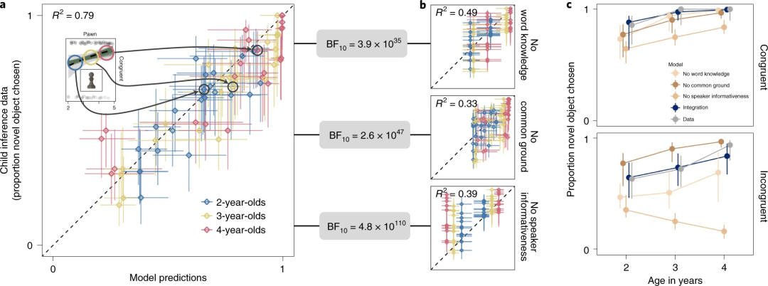 “你可以把这个模型看作是一个小小的计算机程序。我们输入儿童对不同信息的敏感度,在单独的实验中对这些信息进行测量,然后程序模拟如果这些信息源以合理的方式结合起来会发生什么。” 研究的主要作者之一 Michael Henry Tessler 解释说:“该模型可以预测在假设的新情况下应该发生什么,这些信息源都是可用的。”该模型提出了一个明确和实质性的发展理论,它假设,虽然儿童对个人信息源的敏感性随着年龄的增长而增加,但整合进行的方式保持不变 。在模型中,是通过创建年龄相关参数来实现的,这些参数会捕捉对说话者信息量、共同点和对象特定语义知识的敏感性的发展变化。在最后一步,研究人员将这些假设情况转化为实际实验。他们收集了 2 到 5 岁儿童的数据,以测试模型的预测与现实世界数据的吻合程度。实验结论表明,儿童会考虑所有可用的信息来源来推断新词的含义。
