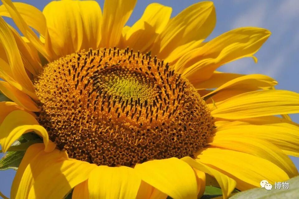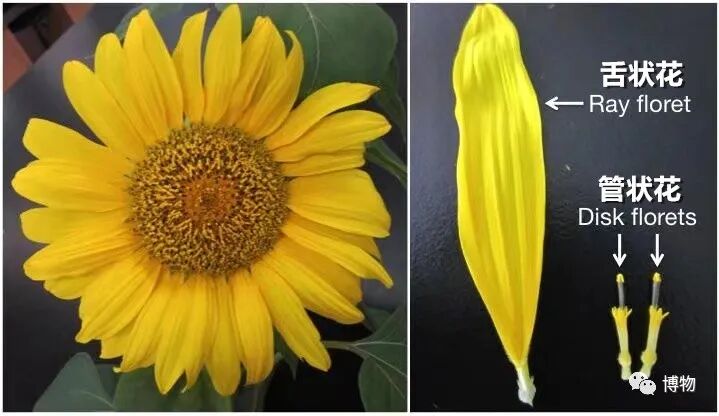 向日葵花盘外沿颜色鲜亮的是不育的舌状花,内里褐色的是可育的管状花——好看的负责招蜂引蝶,其貌不扬的负责孕育种子。