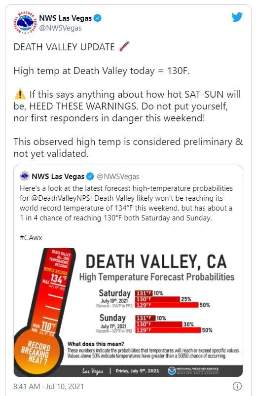 目前地球上被认为最可靠的最高气温纪录,出自2013年的加州死亡谷,当时曾录得54℃的高温纪录。而去年8月,加州死亡谷气温达到了54.4℃,被认为已刷新了纪录,但还未得到世界气象组织的正式验证和承认。所以周五加州死亡谷录得的54.4℃,已经刷新了地球上最可靠的历史最高气温纪录,追平了去年尚未被正式承认的纪录。