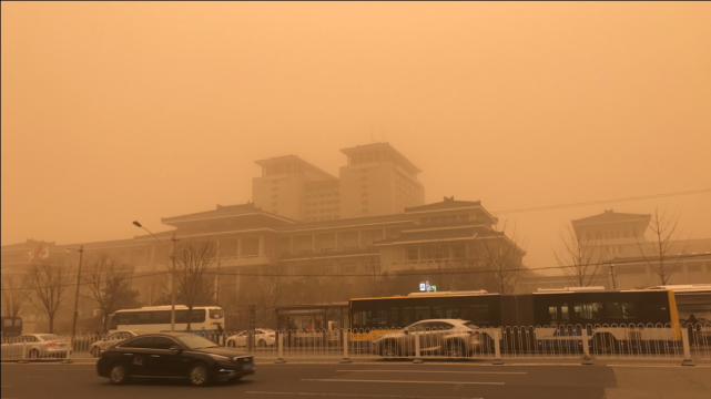 通过我们国家的风云四号卫星监测云图可以看到,3月15日上午,这条土黄色的沙尘带,已经是从西北到华北再到东北,绵延约3000公里,波及到12个省市区。据气象卫星估算,可视的沙尘区面积约为46.6万平方公里,占中国国土面积约1/20(5%)。