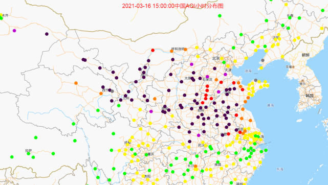 (AQI-空气质量指数,圆点颜色越深,表示沙尘颗粒浓度越大,污染越重)(图片来源:真气网www.aqistudy.cn)