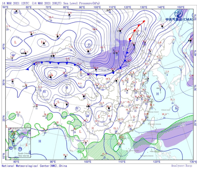 地面气压场示意图(北京时间:3月14日20时)(图片来源:中国气象局)