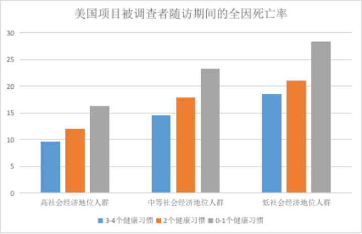可以看出,即使受到了健康生活方式的积极影响,低社会经济地位者依旧比高社会经济地位者要面临更大的健康风险。