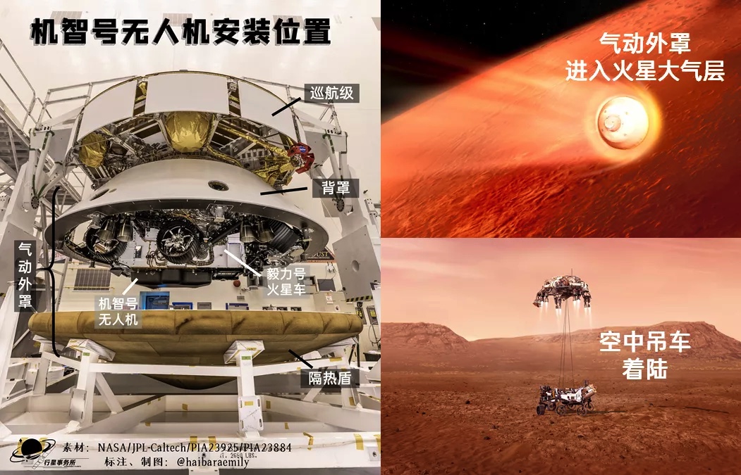 而NASA的毅力号没有环绕器,用的是一个巡航级带着气动外罩(里面塞着火星车)飞往火星,也没有进入环火星轨道的设计。等飞到了火星附近,巡航级一扔,无枝可依的气动外罩只能立刻扎进火星大气层开始着陆,没法等待。