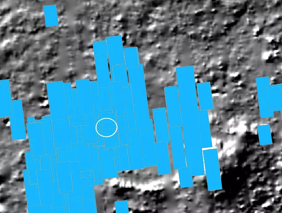 毅力号着陆区杰泽罗撞击坑一带的HiRISE影像覆盖(蓝色),每张图6公里宽,白圈为毅力号的着陆椭圆 | MRO/haibaraemily