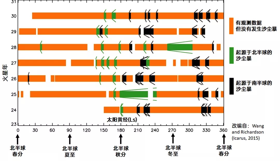 这是1996年到2013年(即火星年23-31)间,火星全球探勘者号(MGS)和火星勘测轨道飞行器(MRO)两个环绕器观测的沙尘暴记录。可以看到火星的沙尘活动集中在下半年,北半球在春夏期间最为宁静。从春分到夏至正中间开始的6个地球月里,北半球历史上没有发生过沙尘暴。