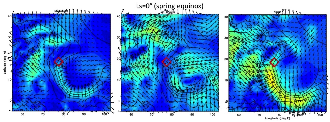 2)另一方面就是利用现有的火星探测器遥感数据(主要是亮温和阳光透射率数据)和着陆区的实际位置、地形情况,对计划着陆区做气象预报。提前避开大的沙尘暴,寻找将来哪个时间段气候更宜降落。当然,这种基于遥感数据的预报只是模型和统计结果,并不是确定性预报,无法精确到火星某个地点几点几分一定有啥气象变化。