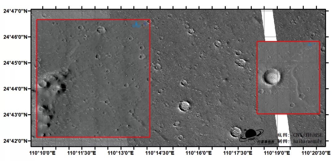 天问一号高分相机传回影像(红框)vs 目前最高清的火星HiRISE影像,空白处是目前尚无HiRISE影像的区域 | CNSA/HiRISE/haibaraemily