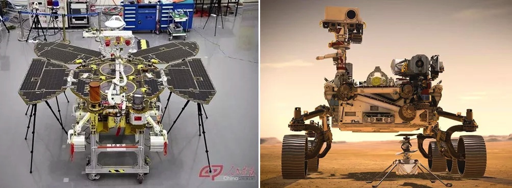 几天后,同在一个火星窗口发射的NASA毅力号也在2021年2月18日抵达火星。两个探测器都携带了火星车。