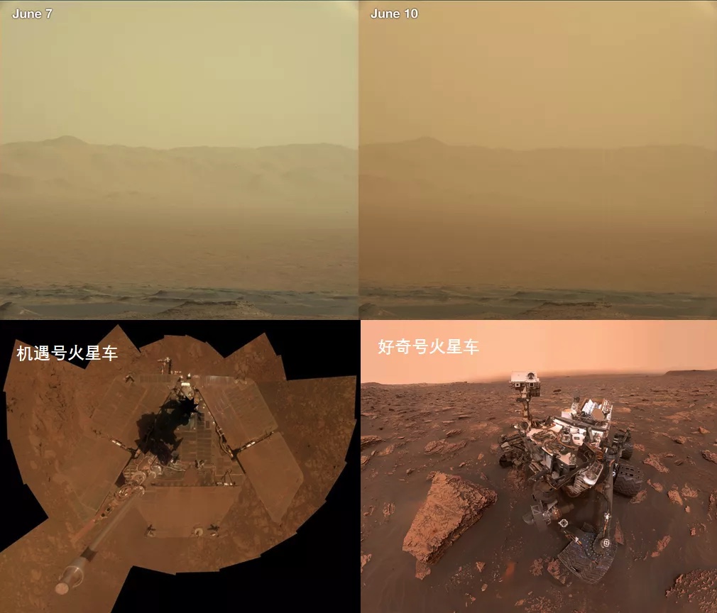 (上)2018年6月,好奇号拍摄的火星沙尘暴景象;(下)机遇号和好奇号火星车 | NASA