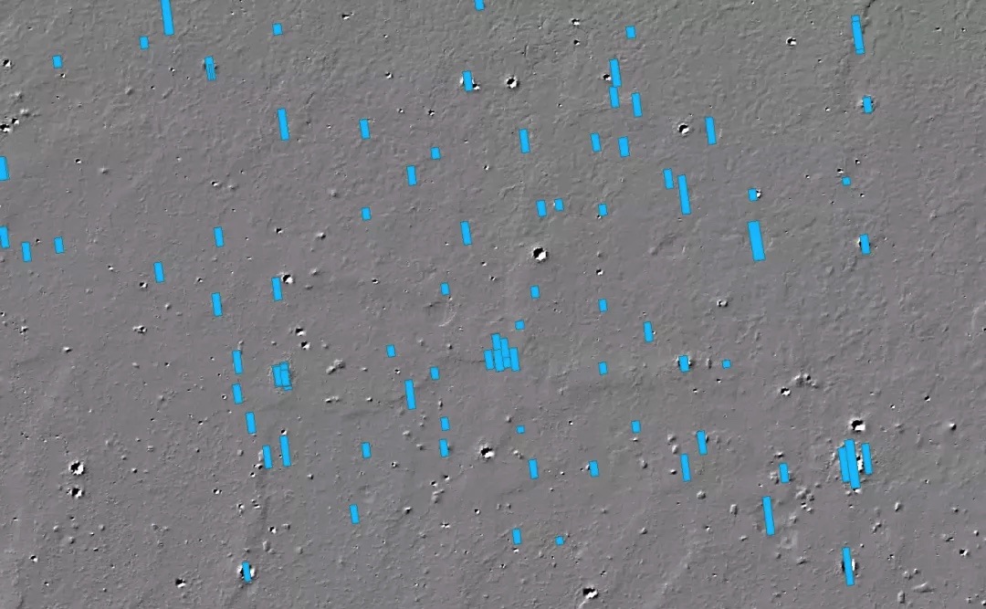 乌托邦平原中一片区域的HiRISE影像(蓝色)覆盖情况,注意每张HiRISE影像宽度6公里 | MRO
