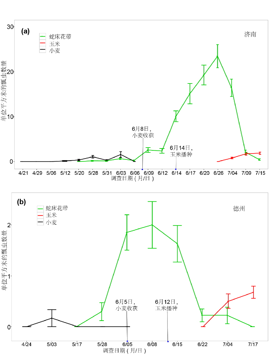 在山东济南(a)和德州(b)试验地,小麦、蛇床花带和玉米上,