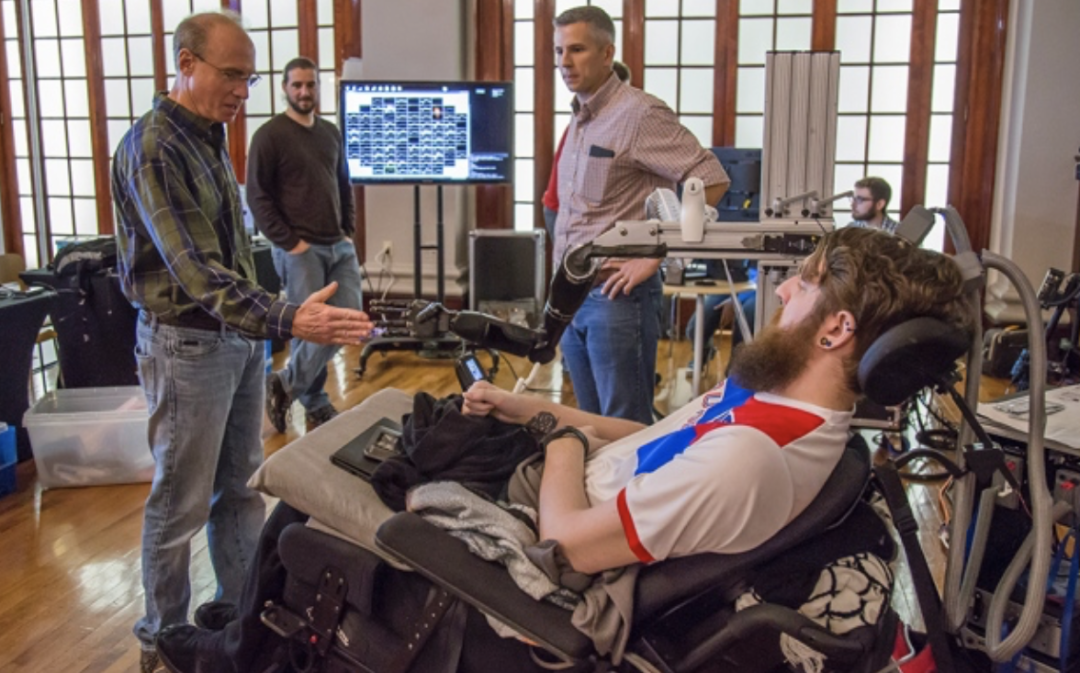 在科幻剧《爱、死亡与机器人》中,有一集是角色通过头戴式设备用意念操控怪兽互搏,这种能让人通过意念进行操控的设备,便是脑机接口(BCI)。 主角通过头戴式设备用意念操控怪兽丨《爱、死亡与机器人》剧照 意念能操控,但没手感啊 现在的一些脑机接口可以让我们用眼睛打字,让猴子看着屏幕打游戏,但如果牵涉到更精细的操作,比如像科幻剧中操控怪兽打架,或者哪怕只是接住一个掉下的杯子,没有手感都很难做到。 我们对四肢和手部传来的感觉习以为常,甚至意识不到这些感觉有多重要。倘若你使用没有触觉反馈的脑机接口,就好像是在操纵抓娃娃机,是不是抓对地方了,抓得够紧吗,会不会抓不住,会不会把娃娃戳破了?我们都不得而知——你很难抓住一个你根本感觉不到的东西。 因为脊椎损伤而失去运动能力的病人,可以利用脑机接口来实现简单的意识操控。现有的脑机接口主要是通过视觉来控制机械手臂抓取、移动物体,就像我们夹娃娃一样缺乏真实抓到的感觉,因此动作会非常笨拙、缓慢。参与脑机接口实验的病人也表示:“当只有视觉反馈的时候,我只能看到那只手碰到了那个物体。如果我用它来捡东西,有时候东西就会掉下来。” 怎么才能让意识操控机械的时候,还能有真实的感觉呢?答案就是双向脑机接口,也就是大脑-机器-大脑。大脑的意识操控机器后,机器还能将触觉刺激反馈给大脑,实现实时操控。 “脑-机-脑”更胜一筹 近日,美国匹兹堡大学的研究团队在《科学》上发布了最新的双向脑机接口研究成果,可以让人用意念控制机械臂捡拾物体时,也能向人的大脑提供直接的触觉反馈。 参与研究的内森·科普兰(Nathan Copeland)在2004年因为车祸成为瘫痪病人,仅有手腕、几根手指和部分肩膀仍有知觉。他六年前就开始参与实验室的脑机接口研究。 科普兰意念操纵机械臂与人握手丨UPMC/Pitt Health Sciences 因为这场实验,他成了世界上第一个同时在大脑运动皮层和躯体感觉层中植入微电极阵列的人,躯体感觉层就是大脑中处理来自身体的感觉信息的区域。这样脑机接口不仅能解码他的运动意图从而操作机械臂,还能够让他感受到触觉反馈。 一开始科普兰参加实验的时候,接受的是依靠视觉来操纵机械臂的传统训练。三年后,科普兰可以非常熟练地用意念让机械臂移动球体或抓住立方体。然而,健全的人类只需要花费5秒钟的抓握任务,科普兰通常要花费20秒左右的时间来完成。 光靠视觉控制的训练已经到达了瓶颈期,研究人员决定让科普兰接受来自机械臂的触觉反馈,打通从机器到大脑的双向反馈通路。 有了触觉反馈,完成同一项任务要省不少时间。表现好时,甚至不到4秒就能完成任务丨参考文献[1] 通过给机械臂的手指根部加装扭矩传感器,来检测手指运动时产生的旋转力,再模拟人类手指感受到压力时的电信号,将电信号通过脑机接口传入到植入在科普兰头皮内部的微电极阵列里,这样科普兰就感受到了机械手臂所触摸的物体。 科普兰因此体验到了一种奇妙的触觉,类似压力和轻微的刺痛感。这种触觉反馈的强度会根据手施加在物体上的力的大小而变化,这让他的训练成果突飞猛进。从前,他会犹豫地摸索,试图确定自己的确抓住了东西。现在有了触觉反馈,他要完成抓握任务,只要10秒就够了,时间缩短了一半。 机械手臂所增加的触觉传感器,实现了和生物体类似的“实时传导”,大脑对手部触觉的延滞时间大约为30毫秒,而传感器每20毫秒就向脑机接口发送一次信号。这种实时的反馈让科普兰觉得非常自然,“这种控制非常符合直觉,以至于我基本上只是在想事情,但好像是在移动我自己的手臂。” 触觉不太真实,大脑还连着线 双向脑机接口可以让人意念操控机械臂做出完整和自然的动作,对帮助瘫痪病人恢复运动能力来说是一大进步。 不过,这种脑机接口技术仍然受到较多的限制,它需要依靠庞大的有线设备与受试者的大脑进行连接。 去年马斯克曾展示了精巧轻便的无线连接设备,类似的装备如果能投入使用,将省去不少麻烦。 马斯克让猴子用意念打游戏,这里的脑机接口设备便是无线的 丨Neuralink 另外,触觉反馈的真实度有待提高,现有的传感器仍无法像真实人类的手一样来控制微妙的力道、完成更复杂的任务。科学家们正在探索通过在病人四肢中装入电极,再配合外骨骼来恢复运动能力。也许有一天,瘫患者操控的不再是机械手臂,而是自己原本的手脚。 未来,这项技术可能让许多瘫痪的患者实现部分自由,比如不必依赖看护者就能给自己倒杯水,并把这杯水送到嘴边。类似这样的“小事”,对他们来说会是改变生活的“大事”。 参考文献 [1] Flesher S N, Downey J E, Weiss J M, et al. A brain-computer interface that evokes tactile sensations improves robotic arm control[J]. Science, 2021, 372(6544): 831-836. [2]https://www.wired.com/story/this-brain-controlled-robotic-arm-can-twist-grasp-and-feel/ 作者:贾懒 编辑:小毛巾、游识猷