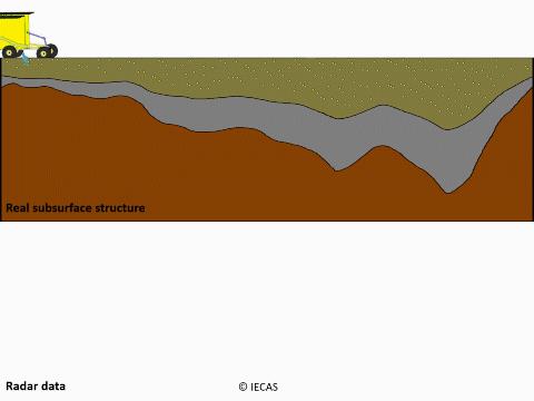 不同物质的介电常数(可以简单理解为让电磁波衰减的能力)不同,因此探测器收到的从不同物质分界面反射回来的电磁波的时间和强度就会不同。次表层雷达的探测原理就是通过发射和接收电磁波信号,借助测量到的雷达信号接收时间和反射强度,反推这些雷达信号穿过了哪些不同的物质,每层物质有多厚。
