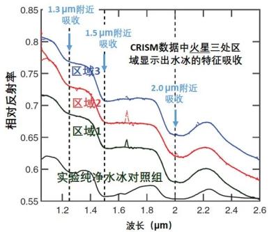 火星勘测轨道飞行器(MRO)搭载的光谱仪CRISM在火星中纬区域地表之下发现水冰的“指纹”(1.65 μm处的尖峰是仪器问题)。