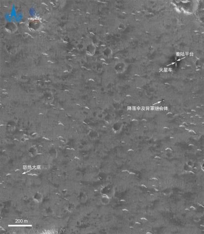 环绕器的高分相机还拍到了着陆平台、祝融号火星车和着陆组件在火星上的照片,几米大小的组件也能尽收眼底。