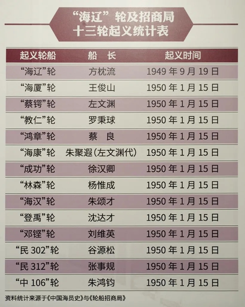 在全国解放大好形势的背景下和“海辽”轮起义成功的鼓舞下,1950年1月15日,香港招商局和13艘海轮在香港起义,招商局大楼和13艘轮船、仓库、码头、拖轮、附属船厂同时升起了五星红旗。此外,“海玄”轮在海上投票决定奔向光明,“永灏”轮船员与英国军警搏斗,“海辰”轮船员为奔回大陆血洒台湾,“中102”登陆艇配合国民党伞兵在东海起义……