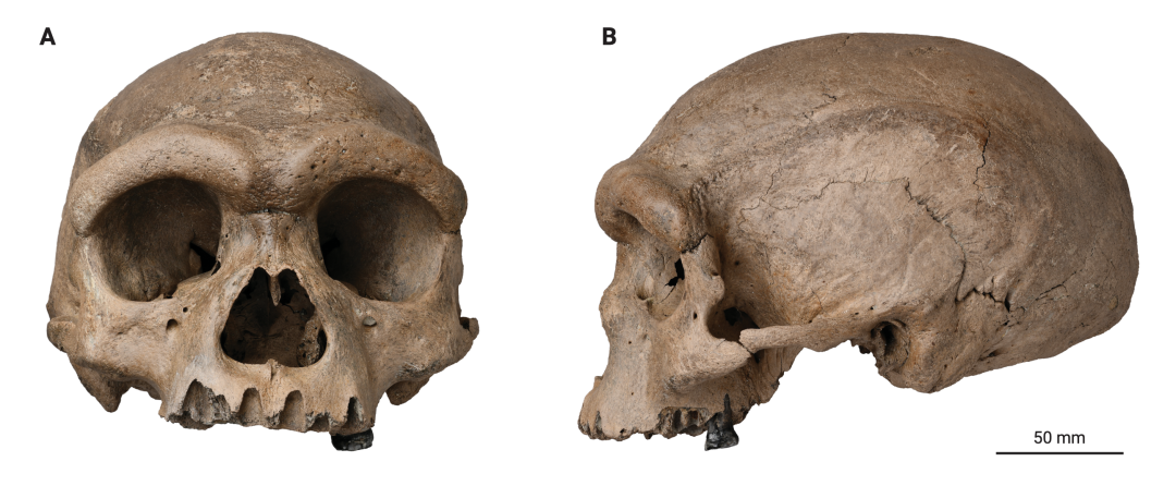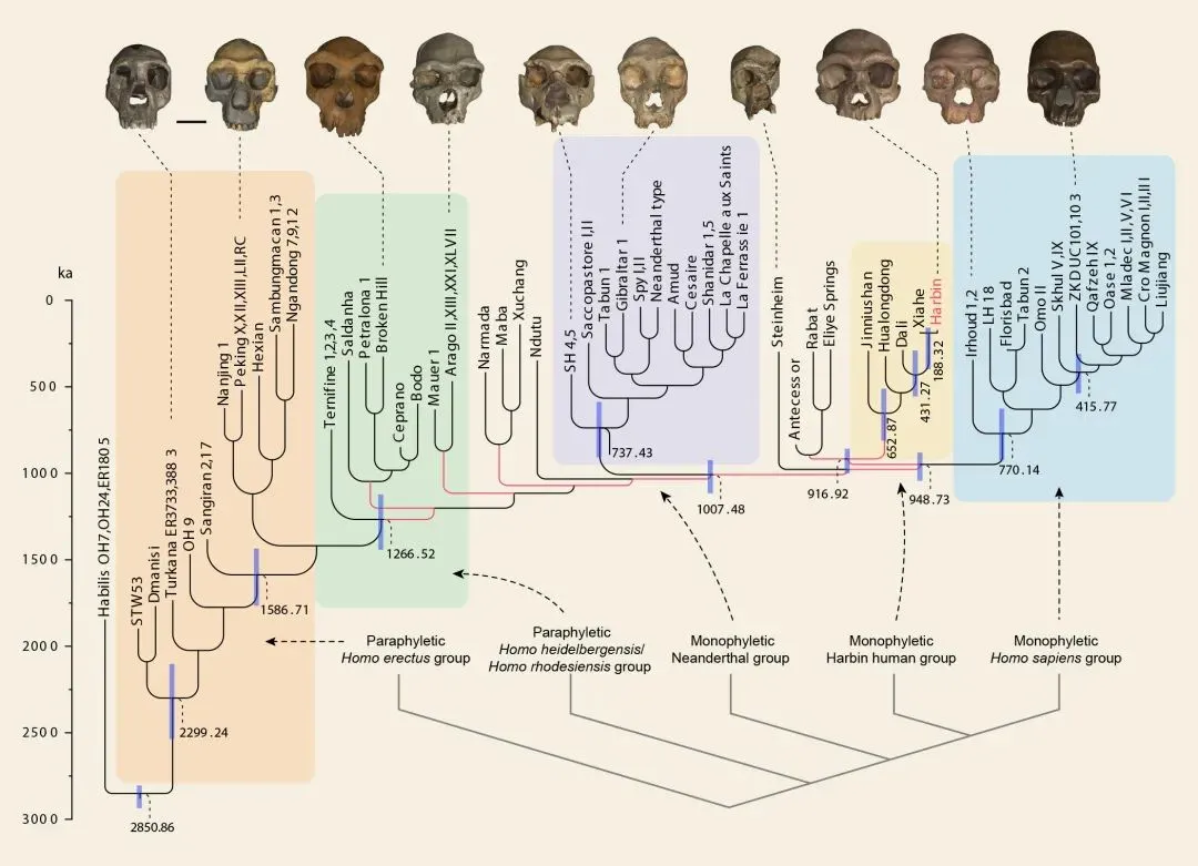 2017 年夏天,河北地质大学教授季强在广西参观玉石市场时,意外得知一位卖货的农民家中收藏有古人类化石。季强是一名古生物学家,通过农民展示的照片,他立刻认识到,这件保存完整、似人又原始的化石,可能蕴含了重要的研究价值。经双方协商,这件化石最终被捐赠给河北地质大学。 季强教授偶遇的古人类化石正面和侧面 | 参考文献[1] 从形态来看,这枚化石很可能属于现代人演化道路上某个已灭绝的亲戚。化石保存得非常好,除了下巴和上牙槽,其他部分几无缺损。这位远古的亲戚是谁?Ta 从哪里来? 2021 年 6 月 25 日,三篇关于这件神秘头骨的研究发表在 Cell 旗下合作期刊《创新》(The Innovation)。来自河北地质大学、中科院古脊椎动物与古人类研究所、英国自然历史博物馆等机构的学者认为,这枚化石至少有 14 万年的历史,且形态上不属于任何一个已知的古人类。他们将其定为一种新的人属成员,名为“龙人”(Homo longi)。 龙人从哪里来:黑龙江 为什么叫龙人,难道是“龙的传人”?其实,这个命名是根据产地而来。这件惊现广西的化石,实际上很可能出土于遥远的黑龙江省哈尔滨市松花江畔。 这块化石的发现和保存,背后是一个祖孙三代人保护化石的故事。事情还要从上世纪 30 年代说起。 根据收藏化石的农民讲述,1933 年侵华日军占领哈尔滨后,曾在松花江上修桥,一名劳工在修建桥墩时发现了这枚奇怪的“人头”,并交给了当时被日本人拉去负责看管劳工的一位中国农民。当时距离北京人头盖骨出土的新闻没过几年,农民意识到这枚“人头”可能的价值,便瞒着日本兵把“人头”带回家,包裹好后藏进院子里的水井,并连夜用土把水井填埋了。 冬季的松花江 这位藏下“人头”的农民,正是季强在广西遇到的那位农民的爷爷。在几十年守口如瓶的务农生活后,老人在临终之际将化石的事告诉了儿孙。之后,儿孙继续在家务农,农闲时做点小买卖,也一直想着把这件古物捐给国家,但却苦于不知何种途径合法可行——直到在广西玉石市场偶遇季强。 经过多次协商,2018 年 5 月,这位不愿透露姓名的农民将化石捐赠给河北地质大学,化石收藏于该校的地球科学博物馆。 遗憾的是,老人离世前并没有告知化石出土的具体地点。通过实地考察,季强等学者初步认定,这枚头骨化石应该产自松花江的河沙沉积物中。随后,他们对这枚化石进行了更详细的研究,并于最近发表论文,证实了这颗古怪的脑袋确实是古人类化石。通过稀土元素、锶同位素等地质化学分析,研究人员认为化石出土于哈尔滨地区约 13.8~30.9 万年前的湖相沉积;利用铀系法直接对化石测年得出,这个古人类至少生活在距今 14.6 万年前。 这意味着,这枚突现于世的化石,是中晚更新世(约100万~1万年前)保存最完整的人类颅骨化石之一。 龙人长什么样:大脑袋,大眼眶 对人类演化的研究很大程度依赖于新材料,但数万年的地质变化、地层堆积、自然分解,让古人类遗骸成为沧海遗珠。即使找到了,化石也可能在埋藏中变形碎裂,这就是为什么我们常常讨论的古人类都“不完整”。例如,出土于德国、距今 60 万年的海德堡人 Mauer 1 是一块下巴;北京猿人现存模型也能看出脑袋顶拼接复原的痕迹;而在俄罗斯丹尼索瓦洞内发现的多个 5~30 万年前的古人类,有的只剩下一两颗牙或一块碎骨,遗传学研究认为他们是一种新的古人类,称为丹尼索瓦人(Denisovan)。 相比来看,龙人头骨保存得非常完整:不仅有能测量脑容量的颅部,还有对研究形态演化很重要的前额、眉弓、牙槽等面部特征。但可惜的是,还有一块对形态研究很重要的面部骨骼——下颌骨——缺失了。 论文指出,龙人是个大脑袋的成年男性,脑容量可达 1420 毫升。这个数值与现代人和尼安德特人相仿,并大于直立人、弗洛瑞斯人、海德堡人等已灭绝的人属成员。 龙人的形象复原 | 参考文献[2] 在形态上,生活在 14.6 万年前的龙人混合了原始和先进的特征。虽然他有个大脑袋,但低扁的坡状额头、粗壮的眉弓、宽嘴和更大的牙都让他看起来和现代人有些距离。 研究人员认为,独特的特征让这件化石区别于以往发现的任何古人类,因此定名为新物种“龙人”。 龙人和我们什么关系? 通过对数十个古人类化石的形态特征分析,研究人员利用计算机测算(简约法和贝叶斯法)了古人类演化的系统发育树,并在其中找到了龙人的位置。 55个古人类化石谱系表,上方竖着的小字是化石编号,代表每一个化石样本。图中5个大组从左到右分别是:直立人族群、海德堡人/罗德西亚族群人、尼安德特人族群、龙人族群、智人(现代人)族群——从这个谱系表来看,龙人族群与现代人族群的关系最近 | 参考文献[2] 论文认为,龙人也许和尼安德特人(Neanderthal)一样,代表了一支现代人的姐妹支系。尼安德特人是一种在 3~4 万年前灭绝的古人类,他们骨骼粗壮、脑袋大,曾与走出非洲的现代人祖先共同生活在亚欧大陆。遗传学研究认为,非洲裔以外的现代人普遍拥有少量的尼安德特人基因。 在本次构建的以形态学数据为基础的谱系树中,相比尼安德特人,龙人族群与现代人的关系甚至可能更近。 其他古人类中,与龙人关系最近的是 16 万年前的甘肃夏河人。2019 年,一项发表于《自然》的古蛋白研究认为,夏河人属于丹尼索瓦人。和尼安德特人类似,丹尼索瓦人也是近年古遗传学研究的明星对象,他