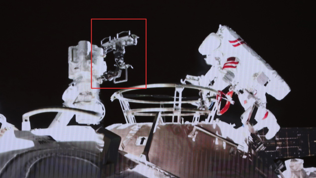 航天员在安装脚限位器(红框处,图片来源:新华社)