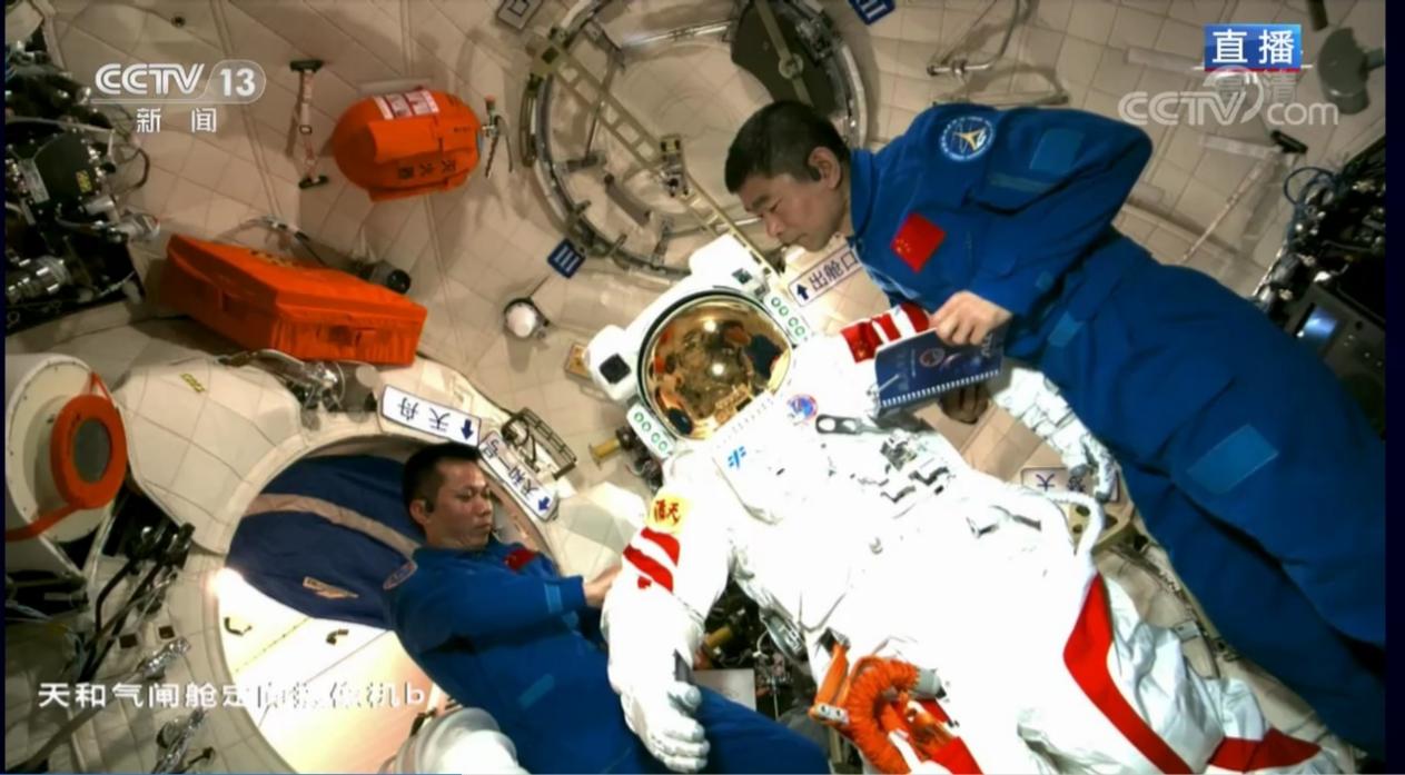 在节点舱内组装航天服的刘伯明、汤洪波(图片来源:央视新闻)