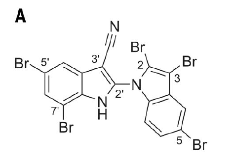 直到 2011 年,研究小组的博士生史蒂芬·布莱因林格(Steffen Breinlinger)在蓝细菌附生的黑藻上发现了一种新的物质,事件才又一次出现了转机。这种物质被研究者称为 AETX(aetokthonotoxin,取自希腊语“杀死鹰的毒药”),是一种五溴化双吲哚生物碱,其化学结构中含有 5 个溴原子;而蓝细菌的标准培养基不含溴,所以实验室培养的蓝细菌不能产生这种代谢物。