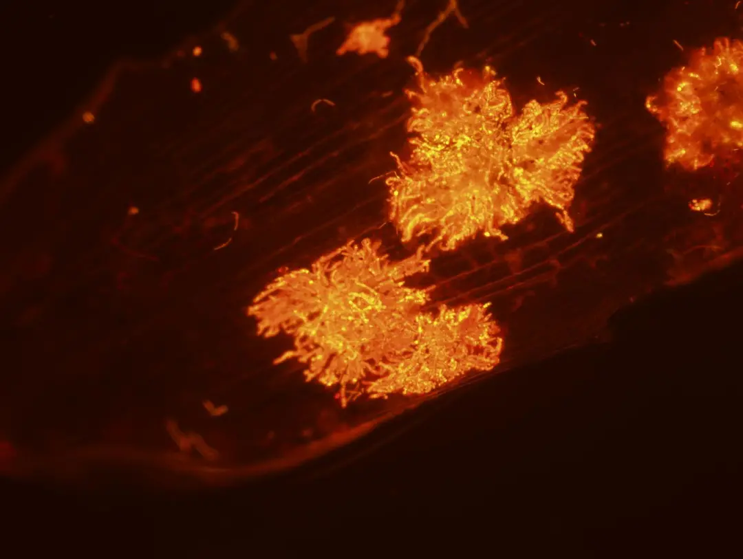 通过荧光显示的黑藻叶片上的蓝细菌菌落 | Susan Wilde
