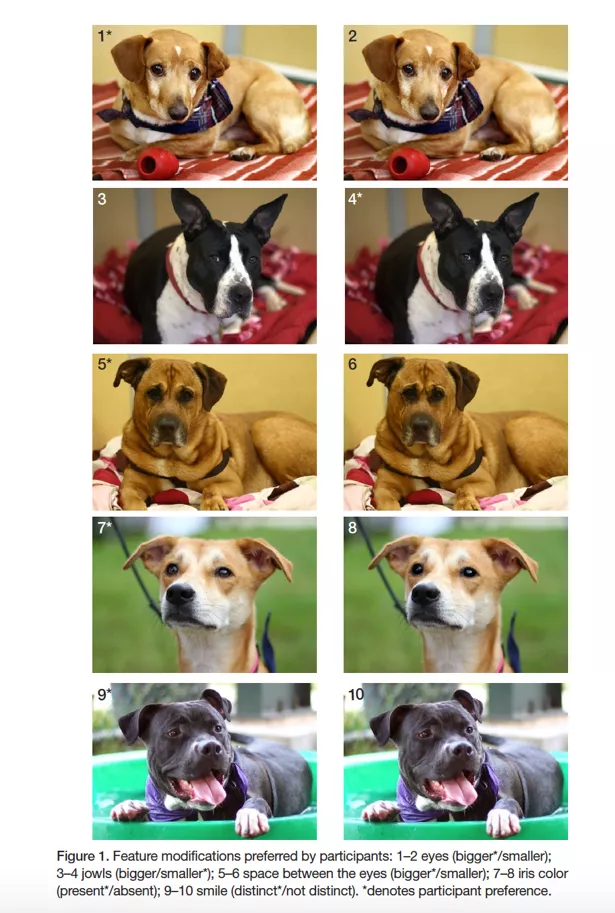 而纽约市立大学和巴纳德学院研究者则具体地研究了受人类欢迎的宠物狗外貌特征。结果显示,在众多外貌特质中,人们对狗狗的五个方面有明显的偏好:“大眼睛”、“颌面小”、“眼间距大”、“瞳孔明显”、“笑容嘴角明显”。