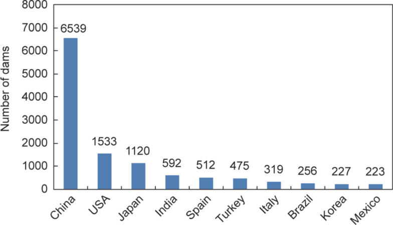 全球主要国家30m高以上大坝数量统计 (图片来源:https://www.sciencedirect.com)