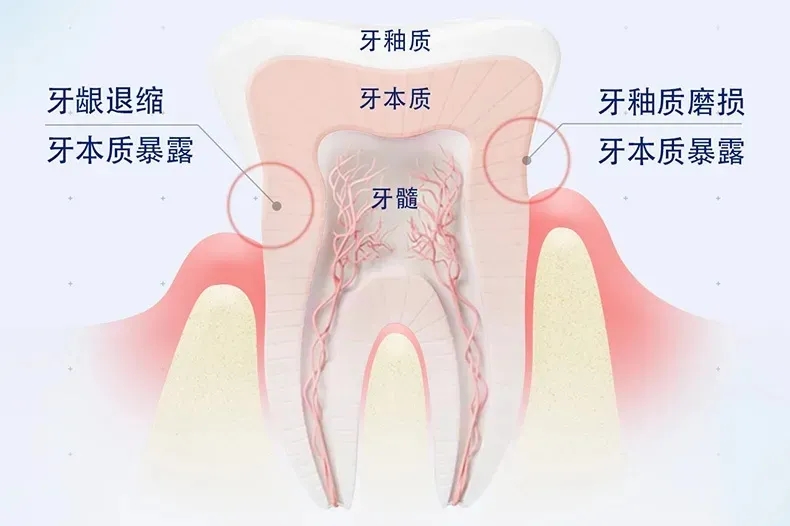 刷牙时力量较大且未使用软毛牙刷,或者错误的刷牙方式(横向拉锯式),牙龈会逐渐退缩导致牙根暴露。同时,这一动作也会破坏牙齿表层的釉质使里面的牙本质暴露。