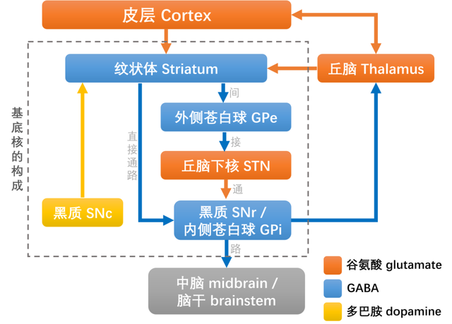 抑制性细胞释放抑制性神经递质GABA(γ-aminobutyric acid,γ-氨基丁酸),抑制下游细胞的活性,让它们“静下来”;而丘脑下核则释放兴奋性神经递质谷氨酸(glutamate),激活下游细胞,让它们“动起来”。