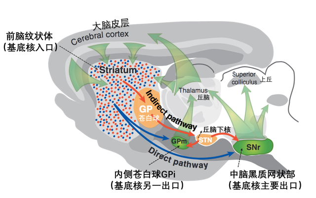 从基底核入口到基底核出口有两条投射通路:直接通路(direct pathway,图8中的蓝色箭头)和间接通路(indirect pathway,图8中的红色箭头)。