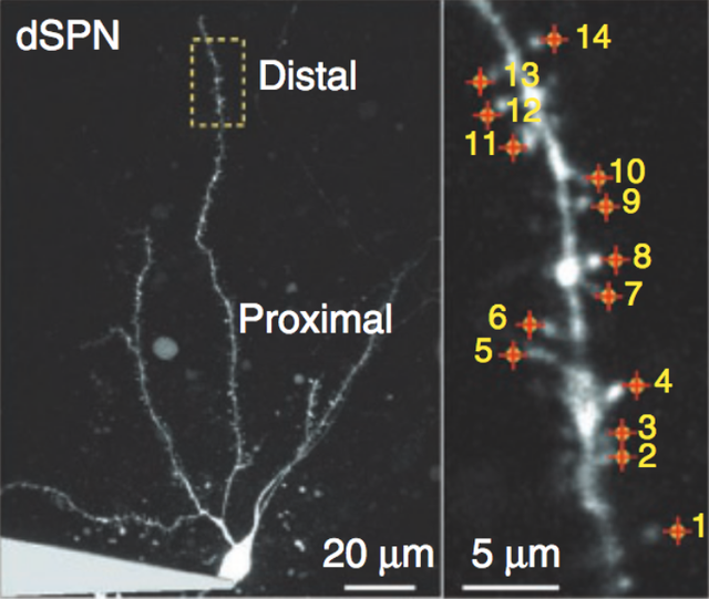 图6. 在纹状体多刺投射神经元SPN 中填充荧光蛋白后,便可看到它的“脚”上有很多像“刺”一样的突起(右图数字所标)[16]。(注意:右图是左图中黄框内的部分)