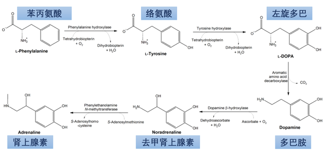 图1. 多巴胺和去甲肾上腺素的生物合成途径。丨图片来自Wikipedia,作者汉化加注。(点击看大图)