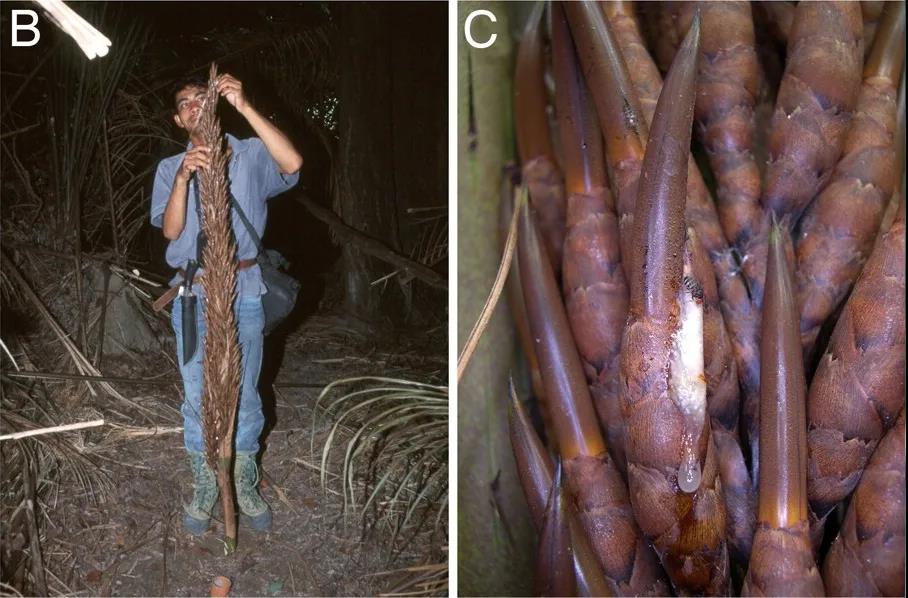 在马来西亚西部,拜罗伊特大学(Universität Bayreuth)的维恩斯(Frank Wiens)和他的研究团队,发现一种学名Eugeissona tristis的棕榈,会生产天然的甜酒。这种棕榈的花序非常巨大,最多能开上千朵花,分泌大量花蜜。花蕾包裹着坚硬的木质化外壳,其中生活着多种酵母,成了天然的酒坛。酵母使花蜜发酵,酒精浓度最大能达到3.8%,是天然食物里最高的。