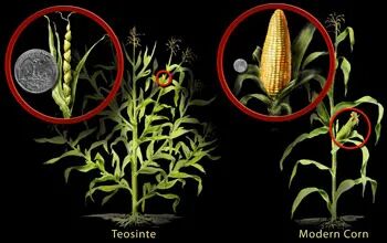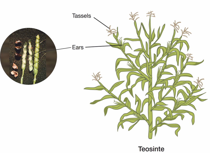 野生墨西哥类蜀黍可以分出很多杈,结出多个个头小小的果实,而现代玉米通常只有一根挺立的茎秆,且一般一株只结出一到两个玉米棒。