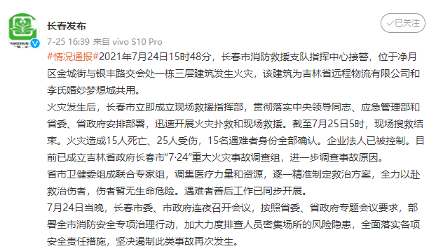 7月24日,长春市净月区金城街与银丰路交会处一栋三层建筑发生火灾,造成15人死亡、25人受伤。该建筑为吉林省远程物流有限公司和李氏婚纱梦想城共用。目前,事故原因正在调查中。@仓储物流企业夏季安全不可松懈这份安全指南请收好来源:湖北消防
