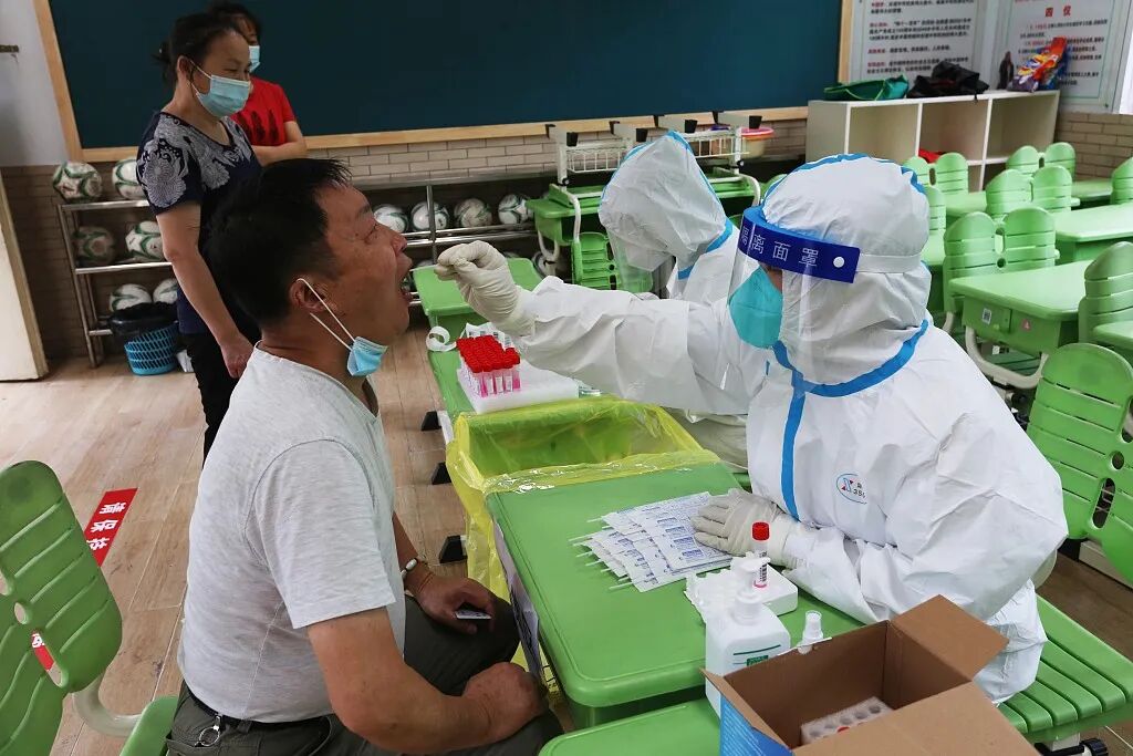 7月29日,南京一检测点内,众多市民在工作人员和志愿者的组织和帮助下,分十人一组进行检测。