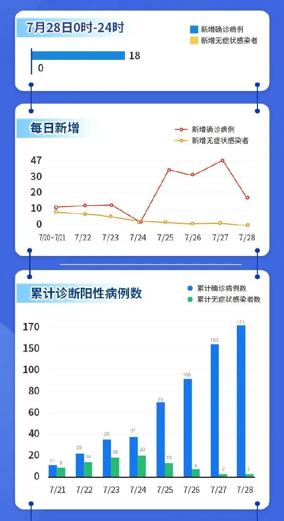 南京疫情传播链波及十余市 7月20日,南京禄口国际机场在每周一次的例行核酸检测中发现9例阳性样本,均为机场保洁人员。接下来的两天里,南京新增28例感染者,其中24例为机场保洁人员,1例为机场司机,3例为机场工作人员的亲属,这意味着,新冠病毒已出现社区传播。 7月24日,南京感染人数达到57人,新增的20人中,半数以上都是此前感染者的亲属,最长的家庭传播链达到了4人。 7月25日~27日,南京日新增确诊病例均在30例以上。 截至7月28日24时,南京市累计报告本土确诊病例171例(轻型78例、普通型86例、重型7例),本土无症状感染者2例。