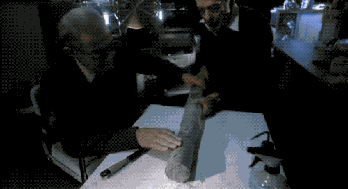 把大西洋底捞上来的表面的六边形孔洞像切蛋糕一样切开,就会看到下方泥土中完美的六边形。动图来源:Volcanoes of the Deep Sea(下同)